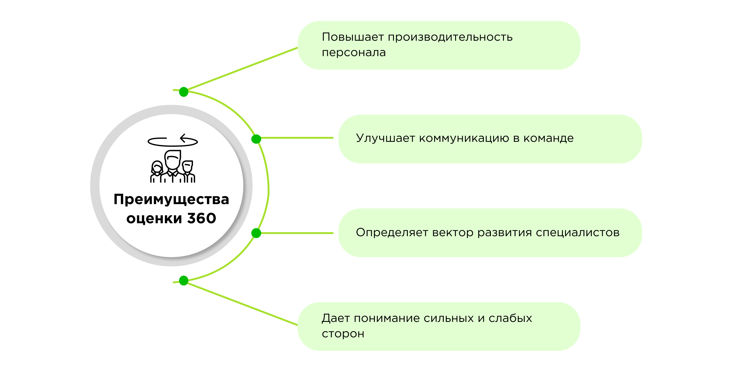 • Полнота данных. Сотрудники получают максимально подробную обратную связь от ближайшего рабочего окружения — коллег, руководителей, подчиненных и клиентов.