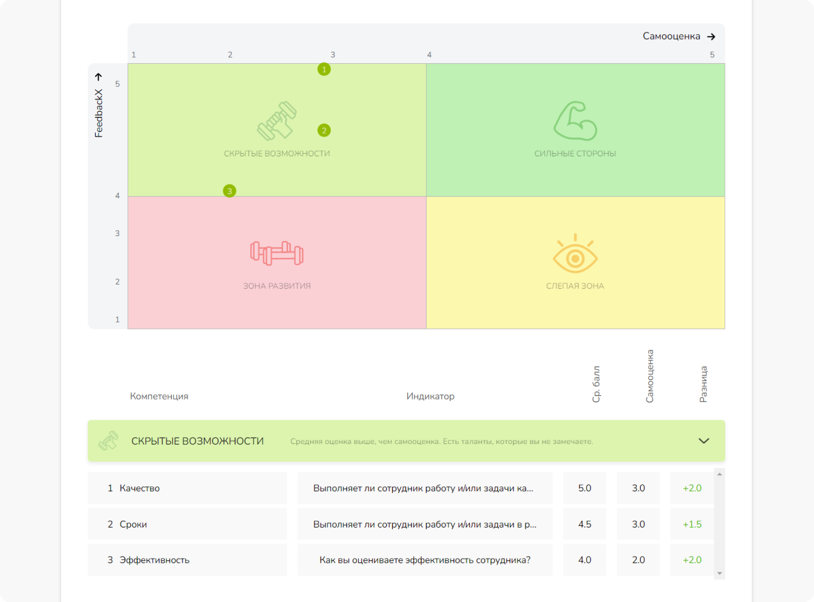 • Во вторую очередь платформа демонстрирует компетенции с завышенной самооценкой и «зоны роста» с низкими оценками — то, что для развития требует усилий от сотрудника и инвестиций в обучающие мероприятия от компании.