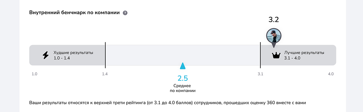 Внутренний бенчмарк дает возможность сравнить результаты сотрудника со средним баллом группы, которая проходила оценку вместе с ним, а также демонстрирует распределение средних баллов по оцененной группе.