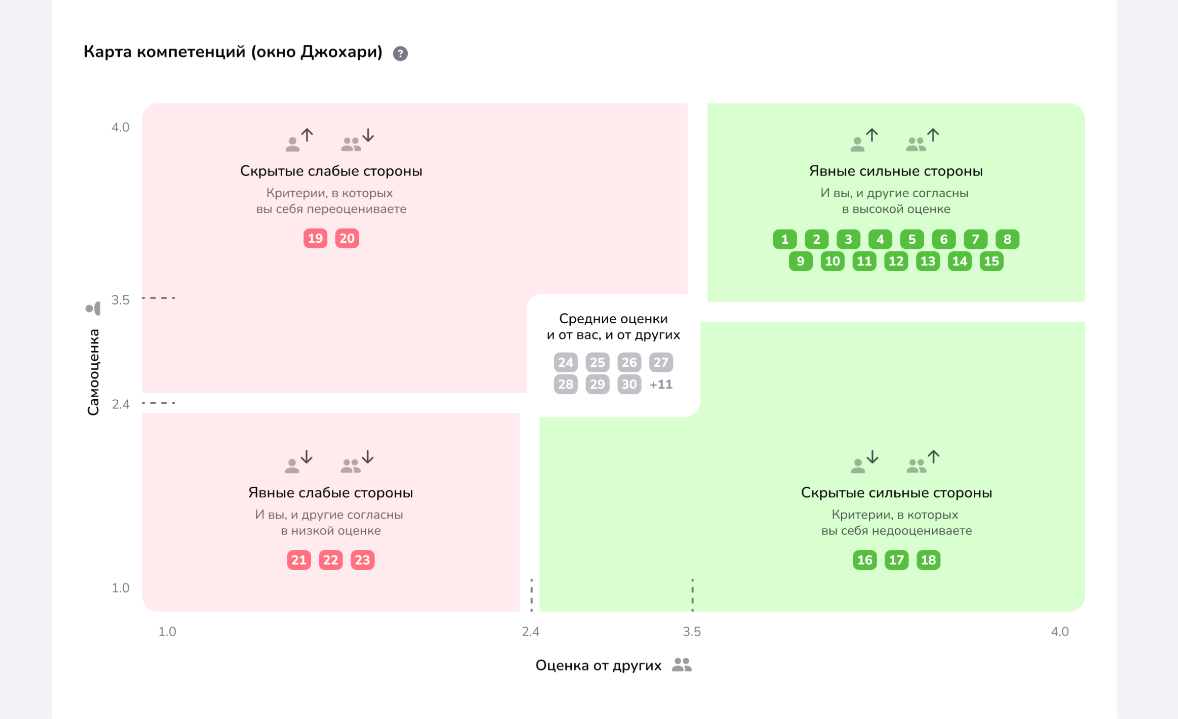 После анализа обратной связи от клиентов, мы пришли к выводу, что классическое «Окно Джохари» (метод, заимствованный из психологии), не в полной мере отражает реалии оценки компетенций и их выраженности.