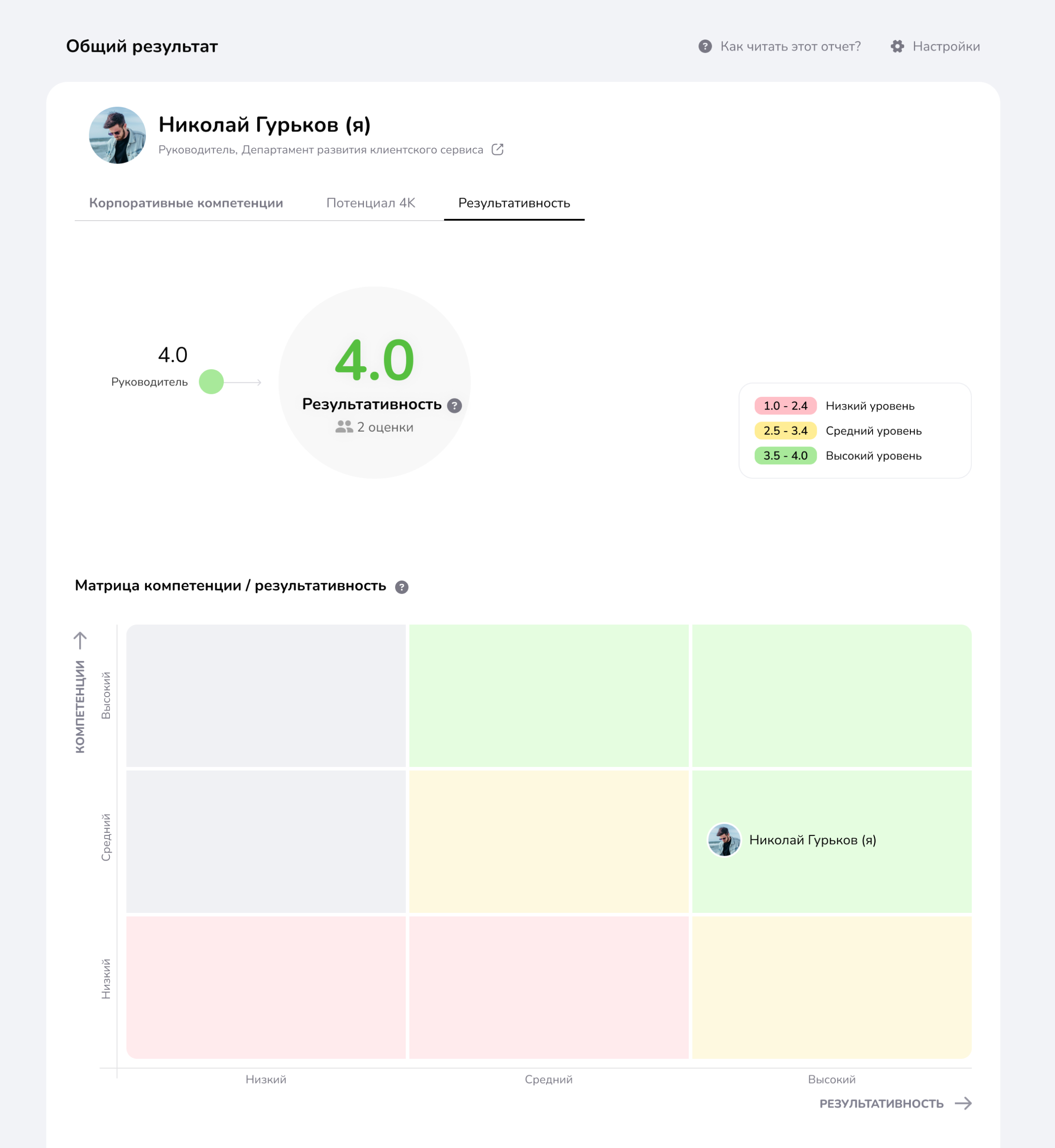 Изучив пожелания пользователей, мы выяснили, что многим руководителям важно оценить не только компетенции и ценности персонала, но также результативность. Поэтому теперь в отчетах FeedbackX есть отдельный вид отчета для представления результатов по этим параметрам оценки. В нем сотрудник видит сравнительную матрицу компетенции/результативность.