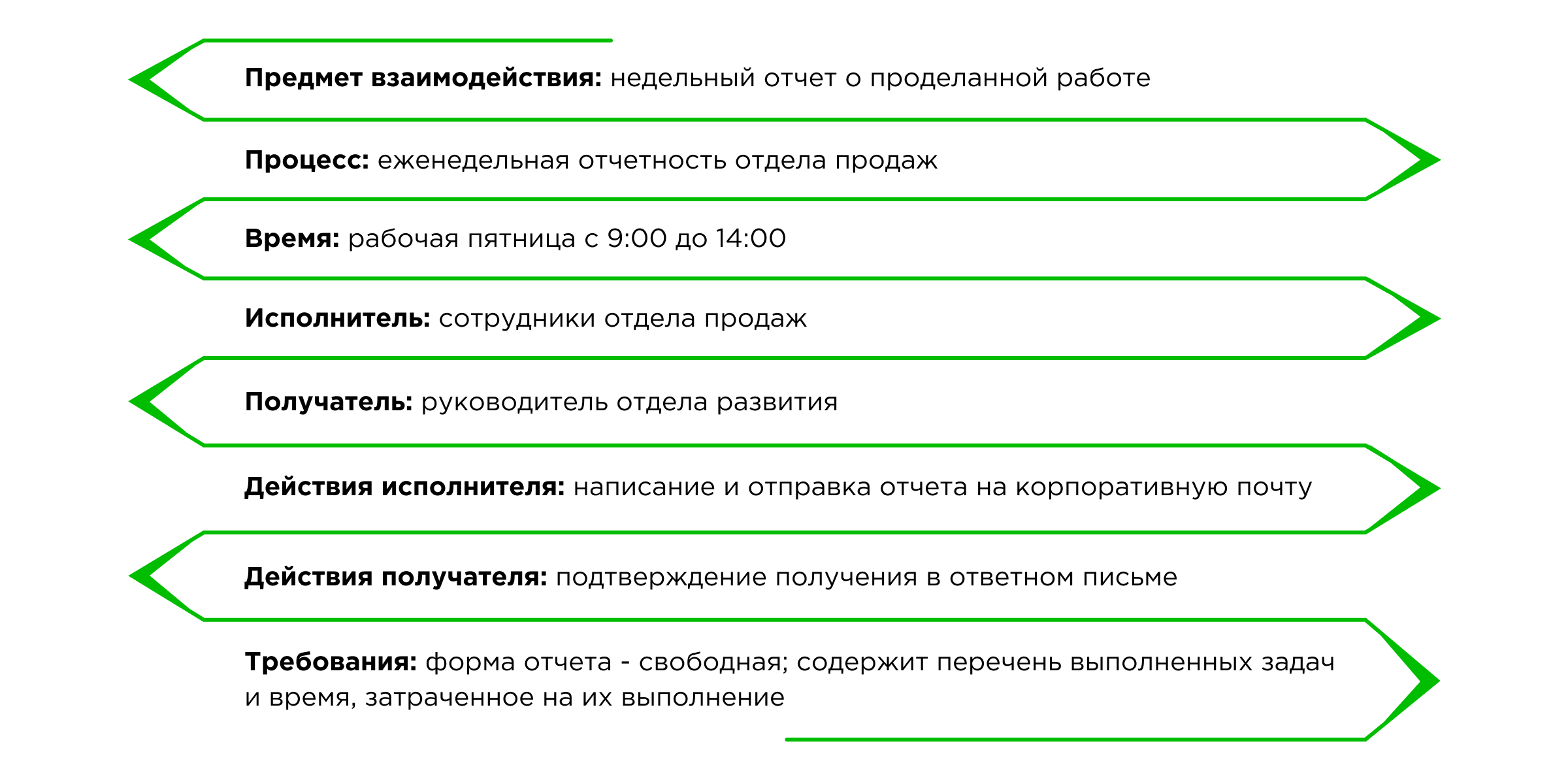Спорные ситуации, когда никто из отделов не хочет выполнять задачу, потому что это «не их зона ответственности», можно решить с помощью регламента взаимодействия. Это документ, в котором закреплена структура сотрудничества подразделений компании и обязанности каждого из них. Важно, чтобы все сотрудники о нем знали, правильно понимали и следовали ему. Сам регламент можно представить в формате тренинга, а для закрепления материала провести тестирование.